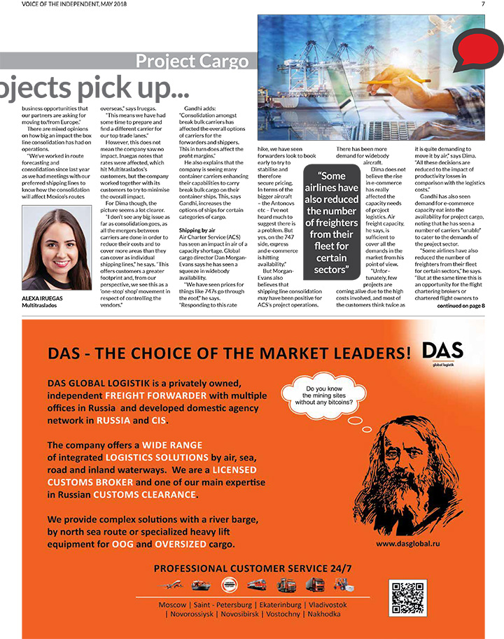 В мае 2018 года в «Voice of the Independent» был размещен рекламный модуль «ДАС ГЛОБАЛ ЛОДЖИСТИК». «Voice of the Independent» - ежемесячное издание, которое освещает проблемы, с которыми сталкиваются логистические компании, используя углубленные отчеты, эксклюзивные источники новостей и большой профессиональный опыт экспертов. Аудитория издания насчитывает более 30 000 профессионалов в области грузоперевозок. «ДАС ГЛОБАЛ ЛОДЖИСТИК» как надежный партнер по перевозкам негабаритных, тяжеловесных и крупногабаритных грузов представил свои услуги на мировом логистическом рынке.